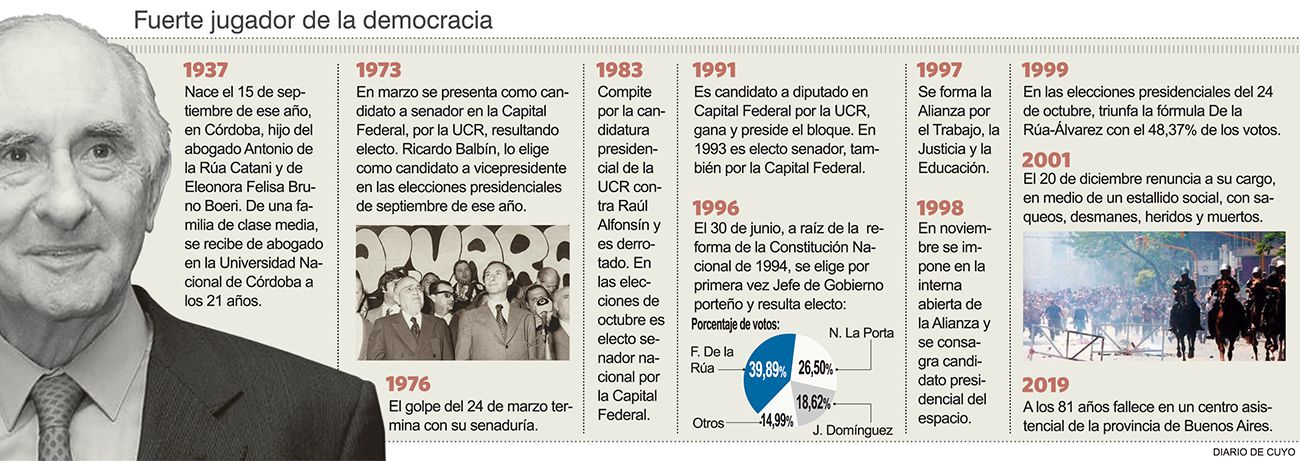 El expresidente Fernando De la Rúa, que pasó a la historia por su renuncia en 2001, tras apenas dos años de gobierno ahogado por la peor crisis económica y social que ha vivido el país, murió ayer a los 81 años, en una jornada de duelo nacional que se mezcló con la conmemoración del Día de la Independencia.