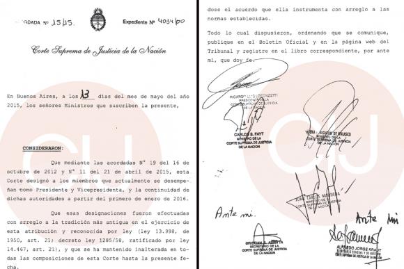 En ese sentido, explica que la re-reelección de Lorenzetti fue consensuada, en realidad, en ‘el acuerdo ordinario celebrado por el tribunal el 14 de abril‘, es decir una semana antes de que efectivamente se firmara la Acordada de designación de autoridades para el período 2016-2019.