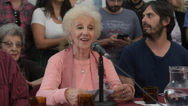 "Es para dar una buena noticia, las Abuelas de Plaza de Mayo, nuestros equipos, nos han ayudado a encontrar una nueva nieta. La enumeramos para darnos fuerzas para aumentar el número. La nieta n° 129 podrá conocer a su padre, que lo tengo acá a mi derecha. A sus hermanos, uno de ellos está acá, a mi izquierda. Y a su tío, quien también está acá", dijo Estela de Carlotto tras el anuncio realizado desde Abuelas de Playo y la aparición de una nueva nieta.