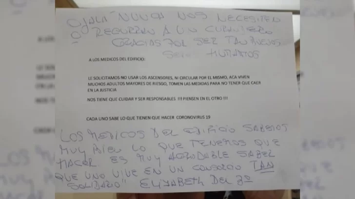 En este caso, el cartel menciona: “A los médicos del edificio: le solicitamos no usar los ascensores ni circular por el mismo. Acá viven muchos adultos mayores de riesgo”, y amenazan con que “tomen medidas para no tener que caer en la Justicia”.