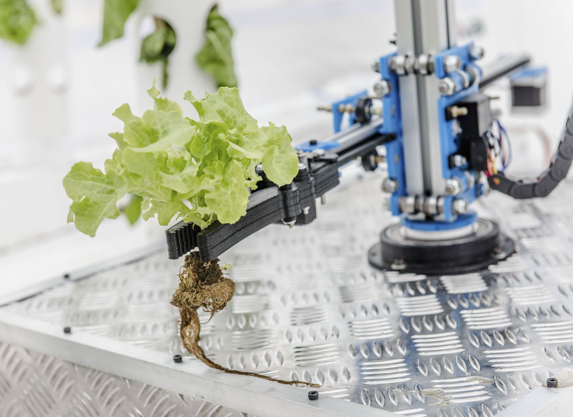 A mano armada. El brazo del robot toma delicadamente la planta de lechuga. Esta rutina es parte del programa que busca producir alimentos de manera sustentable en espacios reducidos.