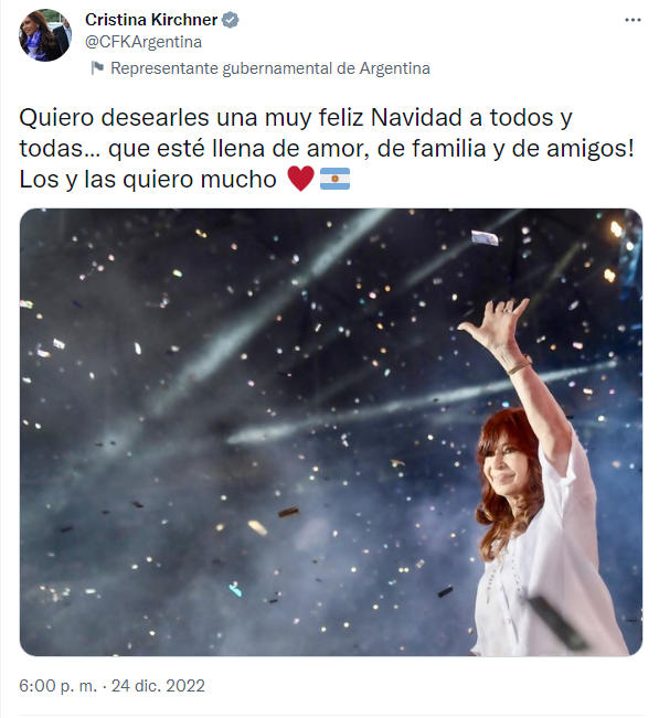 "Quiero desearles una muy feliz Navidad a todos y todas… que esté llena de amor, de familia y de amigos! Los y las quiero mucho", señaló la Vicepresidenta en un texto publicado en su cuenta de la red social Twitter.