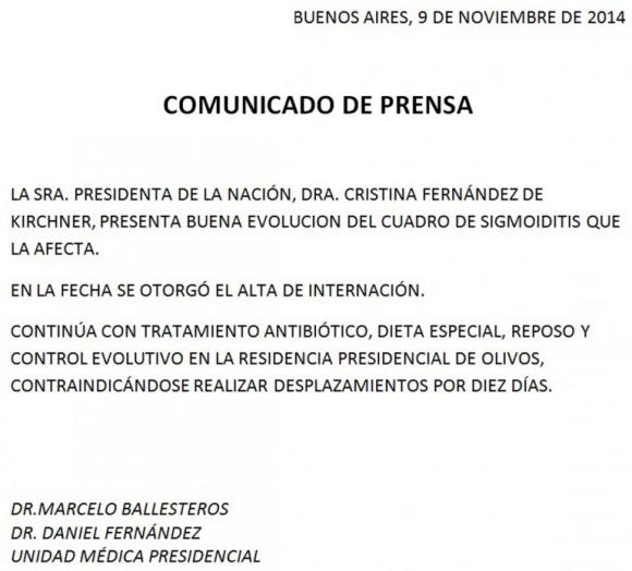 El escueto parte médico firmado por los doctores de la Unidad Médica Presidencial indica que la Presidente "presenta buena evolución del cuadro". "Continúa con tratamiento antibiótico, dieta especial, reposo y control evolutivo en la residencia presidencial de Olivos, contraindicándose realizar desplazamientos por diez días", indicaron los doctores Marcelo Ballesteros y Daniel Fernández.