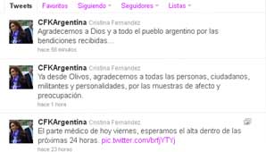 La primera mandataria tuiteó: “Ya desde Olivos, agradecemos a todas las personas, ciudadanos, militantes y personalidades, por las muestras de afecto y preocupación”.