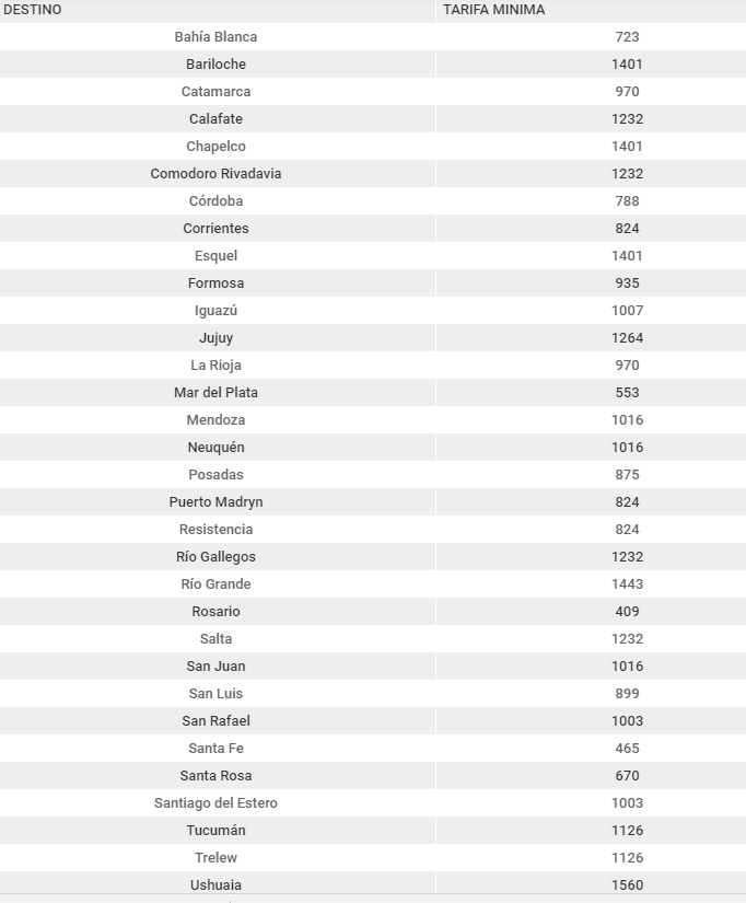 Por ejemplo, un ticket a Córdoba no se podrá cobrar por debajo de los $788, mientras que desde la ciudad de Buenos Aires a Mar del Plata se deberá ubicar igual o por encima a los 553 pesos. A Jujuy, el piso de tarifa desde Buenos Aires se ubica en los $1.264, el de Río Gallegos en $1.232 y el de Ushuaia –el tramo con el piso más alto– en 1.560 pesos.