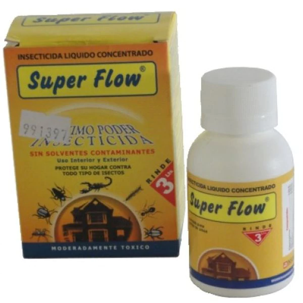 3. CAJA DE CARTÓN ROTULADA COMO: INSECTICIDA LÍQUIDO CONCENTRADO Super flow, MÁXIMO PODER INSECTICIDA, SIN SOLVENTES CONTAMINANTES, PROTEGE SU HOGAR CONTRA TODO TIPO DE INSECTOS, USO INTERIOR Y EXTERIOR AROMATIZADO, NO MANCHA, Contenido 24 Sachets X 15 cc. Inscripto y Autorizado por la ASSAL Certificado N° 10356/2009 RPPD N° 21000014 RPED N° 21-000001, RNE N° 21-0031186, Composición: Cipermetrina: 3 grs, DDVP 7 grs, Citronela: 0,25 grs, Inertes, coadyudantes y componentes de formulación: 100 cc. Sin dato de Lote y Vencimiento.