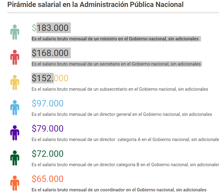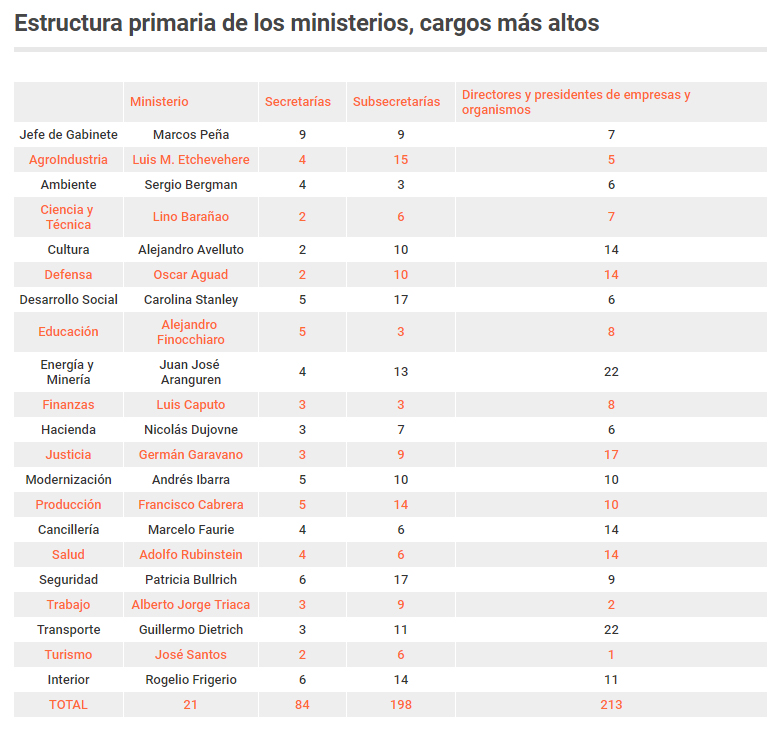 Cabe notar que los puestos de máxima jerarquía en el Poder Ejecutivo Nacional suman, según el organigrama del “mapa del Estado”, por parte de los 20 Ministerios y la Jefatura de Gabinete de Ministros, 516, distribuidos en 84 secretarías; 198 subsecretarías  y 213 direcciones nacionales y presidentes de empresas públicas y de entes del sector público no financiero.