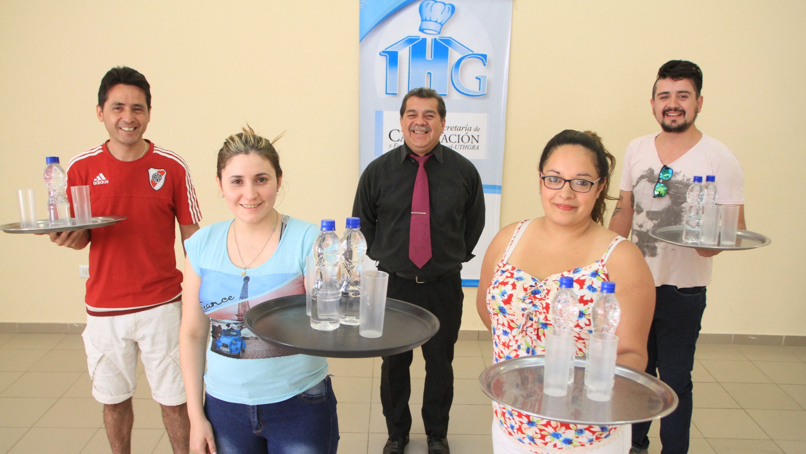 "No importa en la partida ocupar el primer lugar. Sí, que la mano esté bien extendida para sujetar la bandeja. Si tienen la antideslizante, mejor. Vayan por el lado interno de las curvas, pero no se acerquen demasiado si hay público al costado, porque puede haber un toquecito o algo, se cae la botella y quedan afuera", era una nueva advertencia y la clase asimila cada dato.