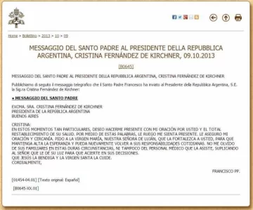 Francisco le envió un telegrama a la presidenta, luego de que fuera operada por un hematoma subdural. El Santo Padre aboga por el "total restablecimiento de su salud".