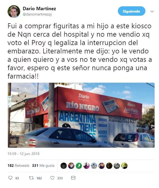 El legislador nacional de Neuquén, Darío Martínez, contó un insólito episodio que vivió tras adelantar que votará a favor de la interrupción voluntaria del embarazo. Cuando fue a comprar figuritas para el Mundial a un kiosco, el dueño del comercio no quiso venderle. "Yo le vendo a quien quiero y a vos no te vendo porque votás a favor", argumentó el comerciante. Sin embargo, ese hecho, algo anecdótico, estuvo lejos de lo que se vivió en otras provincias.