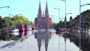 Buenos Aires, 1 de noviembre.- El río Luján se desbordó entre la medianoche y las primeras horas de este miércoles, por lo que toda la ciudad amaneció inundada y la emblemática Basílica quedó aislada por el agua.. Hay preocupación entre los vecinos, debido a que el río sube y avanza por las calles.