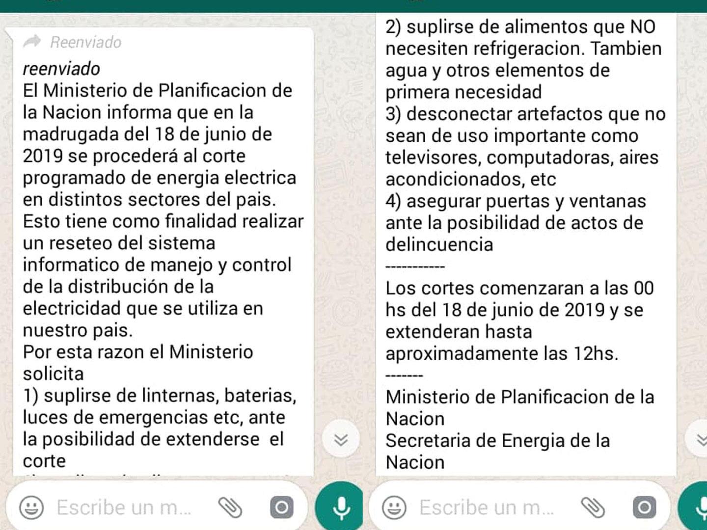 El mensaje que se divulgaba dice: "El Ministerio de Planificación de la Nación informa que en la madrugada del 18 de junio de 2019 se procederá al corte programado de energía eléctrica en distintos sectores del país. Esto tiene como finalidad realizar un reseteo del sistema informático de manejo y control de la distribución de la electricidad que se utiliza en nuestro país.