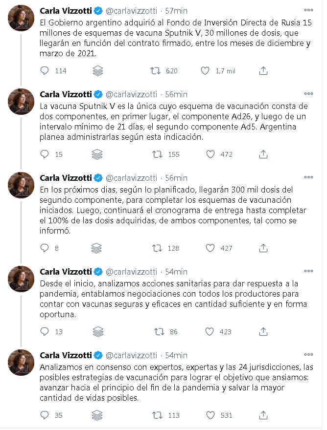 Sin embargo, la campaña seguirá como se había pensado en un primer momento. A través de las redes sociales la Vizzotti aclaró que en los próximos días llegarán 300 mil segundas dosis para completar los esquemas de vacunación ya iniciados.
