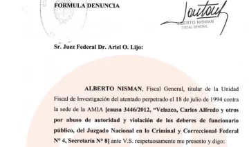 Buenos Aires, 20 de enero.- El Centro de Información Judicial publicó hoy en forma completa la denuncia presentada por el fiscal Alberto Nisman ante el juez Ariel Lijo contra la presidenta de la Nación, Cristina Kirchner , a quien acusó de encubrir a los responsables iraníes del atentado a AMIA a cambio de reabrir el comercio entre ambos países.