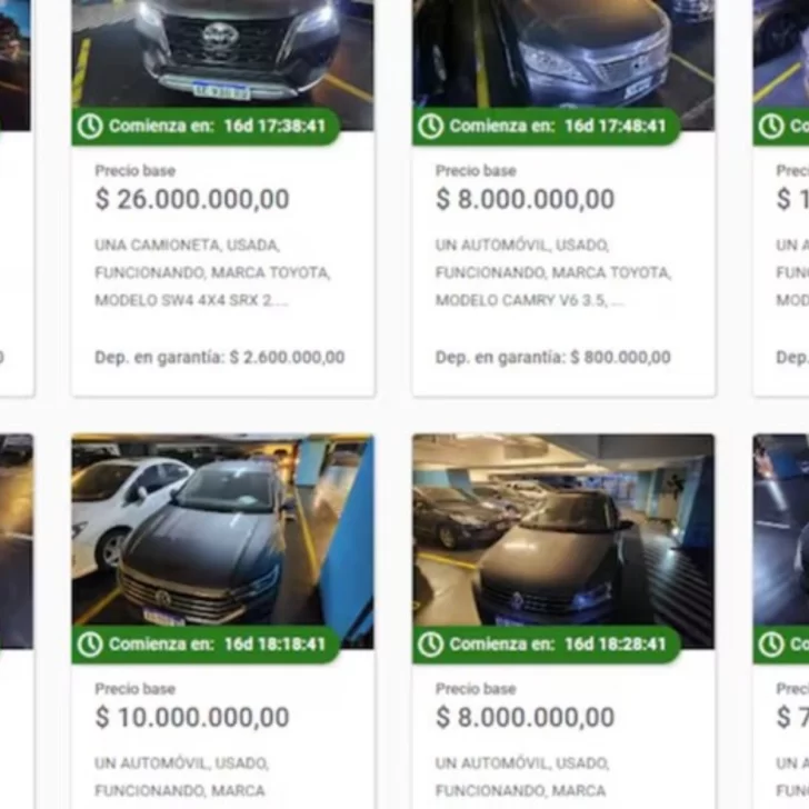 Entre los vehículos que se subastan se encuentran autos, camionetas, minibuses y un tráiler. Todos son usados y van desde los $3.000.000 a los $26.000.000. Las marcas que se ofrecen son Toyota, Nissan, Volkswagen, Peugeot, Chevrolet y Renault.