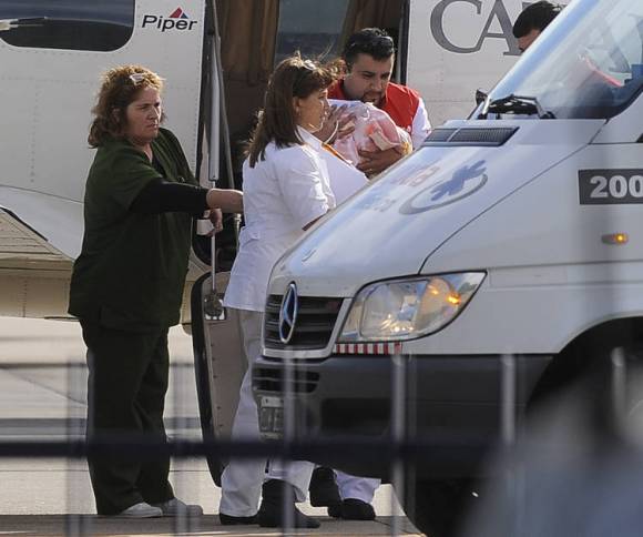 La niña y sus padres llegaron a las 15.49 al Aeropuerto Internacional de San Fernando, provincia de Buenos Aires, en un avión equipado con emergencia en Neonatología, y desde allí fue trasladada en ambulancia al centro de salud, en Almagro. Fuentes del Ministerio de Salud chaqueño informaron a DyN que el traslado se hizo en el mismo avión en el que había llegado por la mañana el equipo médico encabezado por la coordinadora de Cuidados Intensivos Neonatales del centro de salud porteño, Maritza Márquez, enviado para asistir a la beba.