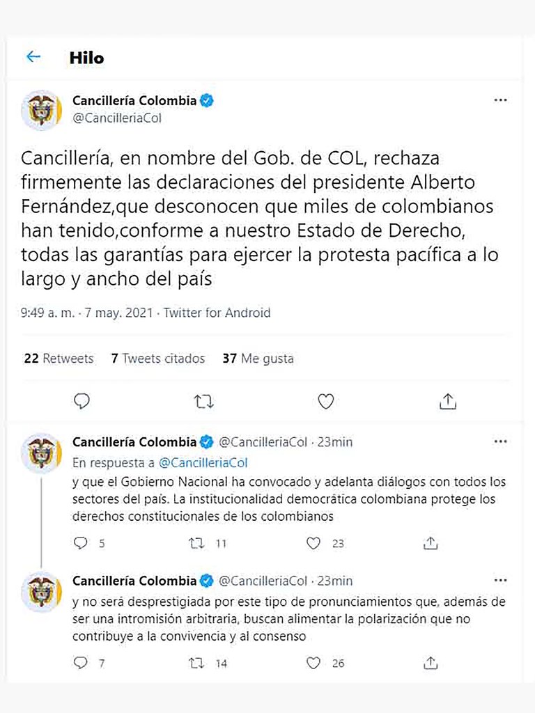 “Cancillería, en nombre del Gob. de COL, rechaza firmemente las declaraciones del presidente Alberto Fernández,que desconocen que miles de colombianos han tenido,conforme a nuestro Estado de Derecho, todas las garantías para ejercer la protesta pacífica a lo largo y ancho del país”, comienza el mensaje emitido por la cuenta oficial de el ministerio de relaciones exteriores de Duque.