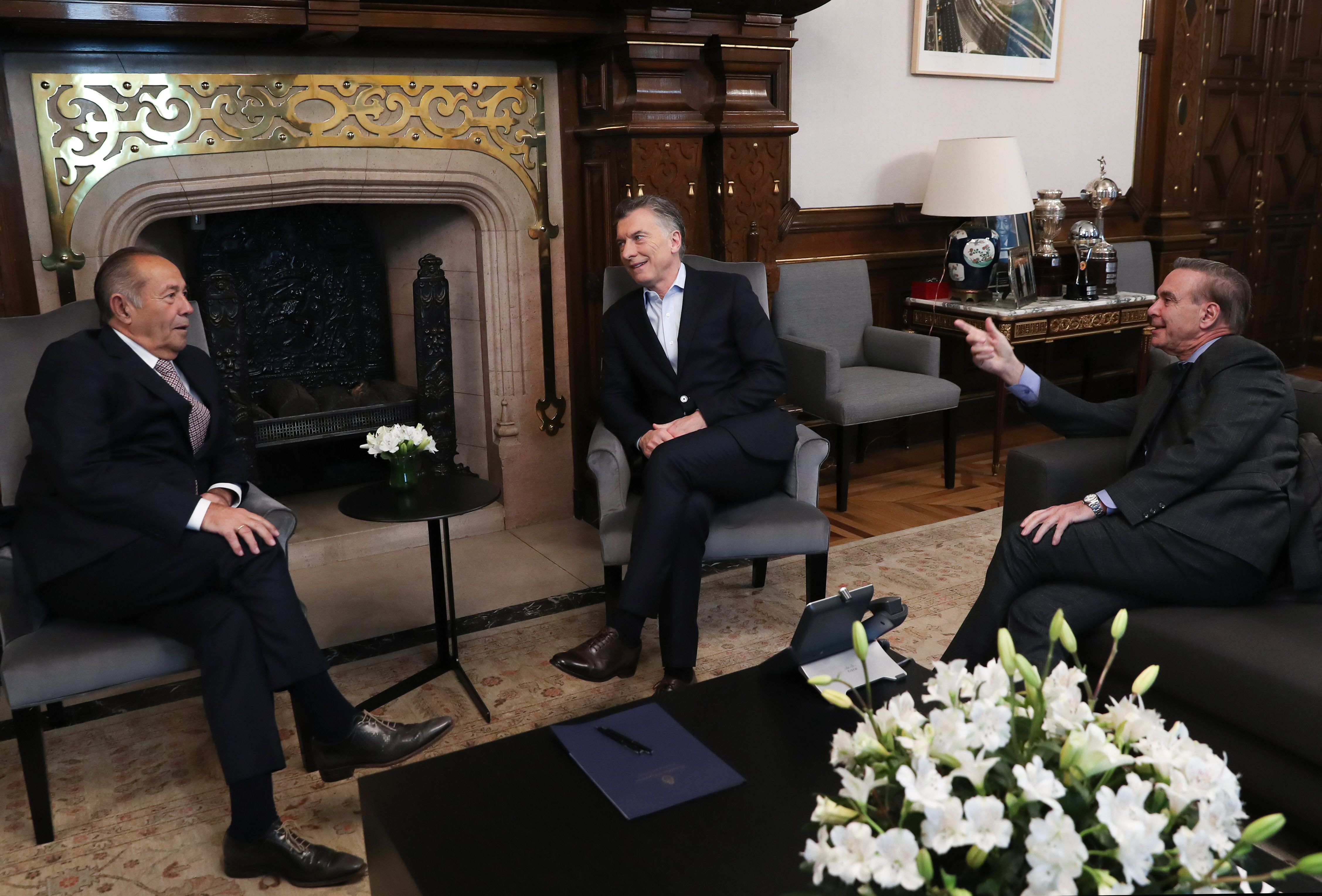 El nuevo aliado. Macri, Pichetto y Rodríguez Saá ayer en el encuentro en la Casa Rosada, y de la cual el Gobierno difundió una fotografía en la que se ve a los tres en una charla descontracturada