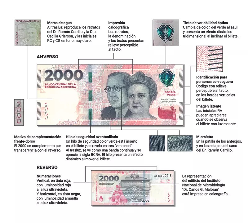El nuevo billete de 2000 pesos incluye, para mayor seguridad de los usuarios, marca de agua. Además, en el sector en blanco, al observar el billete al trasluz, se perciben los retratos del Dr. Ramón Carrillo y de la Dra. Cecilia Grierson, así como las iniciales de sus nombres en tono claro. Por otro lado, tiene hilo de seguridad de color verde aventanillado. A trasluz, se ve como una banda continua y se aprecia la sigla BCRA.