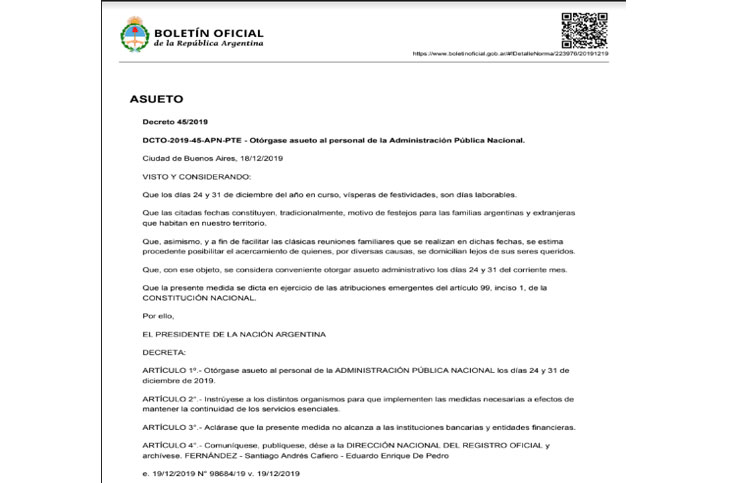 El gobierno nacional dispuso asueto para el personal de la Administración Pública Nacional los días 24 y 31 de diciembre, vísperas de festividades, que son días laborables.