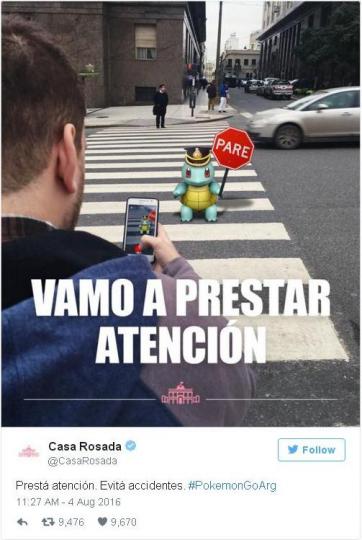 Buenos Aires.- ‘Prestá atención. Evitá accidentes’, dice el tweet que publicó este viernes la Casa Rosada en la red social, acompañada con el hashtag #PokemonGoArg.
