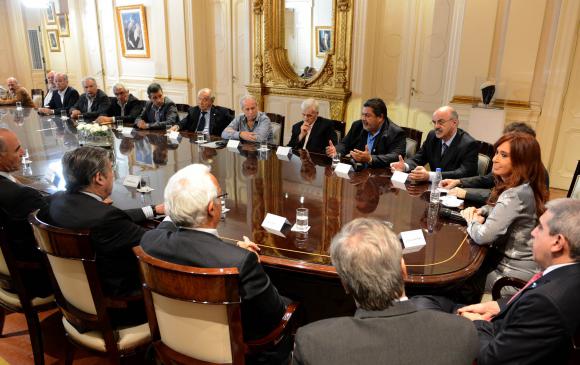 Buenos Aires, 20 de mayo.- Los representantes de los gremios de empleados de comercio, trabajadores de la construcción, estatales y metalúrgicos y las respectivas cámaras empresarias con las que negocian sus salarios fueron recibidos esta tarde por la Presidente en la Casa Rosada para la firma de acuerdos paritarios.