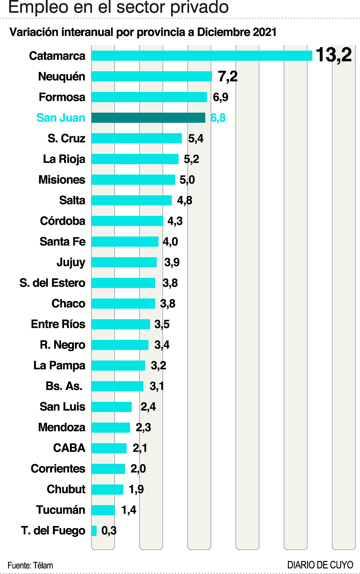Con una suba del 3,2% en todo el país, las 24 jurisdicciones mostraron una mejora en cuanto a la creación de empleo registrado privado entre diciembre de 2020 y el mismo mes de 2021, aunque en la comparación contra febrero de 2020 -antes del inicio de la pandemia de coronavirus en la Argentina- hubo 17 provincias con alzas y 7 distritos con descensos, con una leve recuperación del 0,2% en el nivel general.