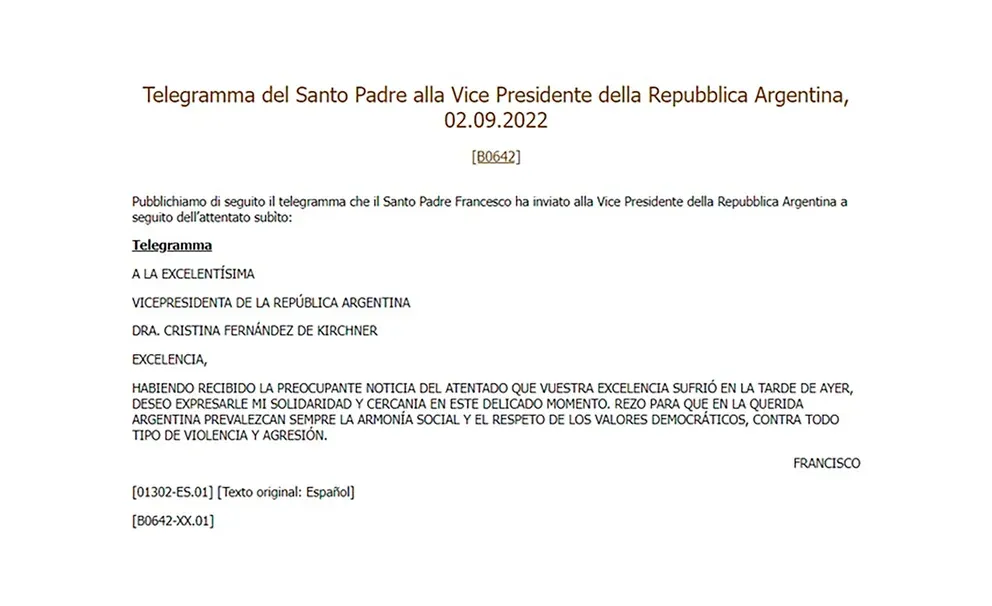 Con el encabezado “a la excelentísima vicepresidenta de la República Argentina, Cristina Fernández de Kirchner”, el máximo representante de la Iglesia Católica le envió también un telegrama oficial a la Vicepresidenta con el siguiente mensaje: “Habiendo recibido la preocupante noticia del atentado que vuestra excelencia sufrió en la tarde de ayer, deseo expresarle mi solidaridad y cercanía en este delicado momento”.