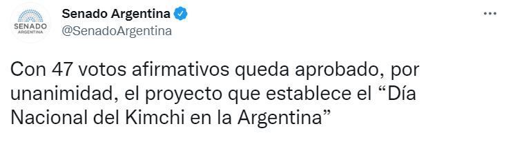 Con 47 votos a favor y ninguno en contra, el Senado dio media sanción al proyecto que establece el 22 de noviembre de cada año como “Día Nacional del Kimchi en la Argentina”.