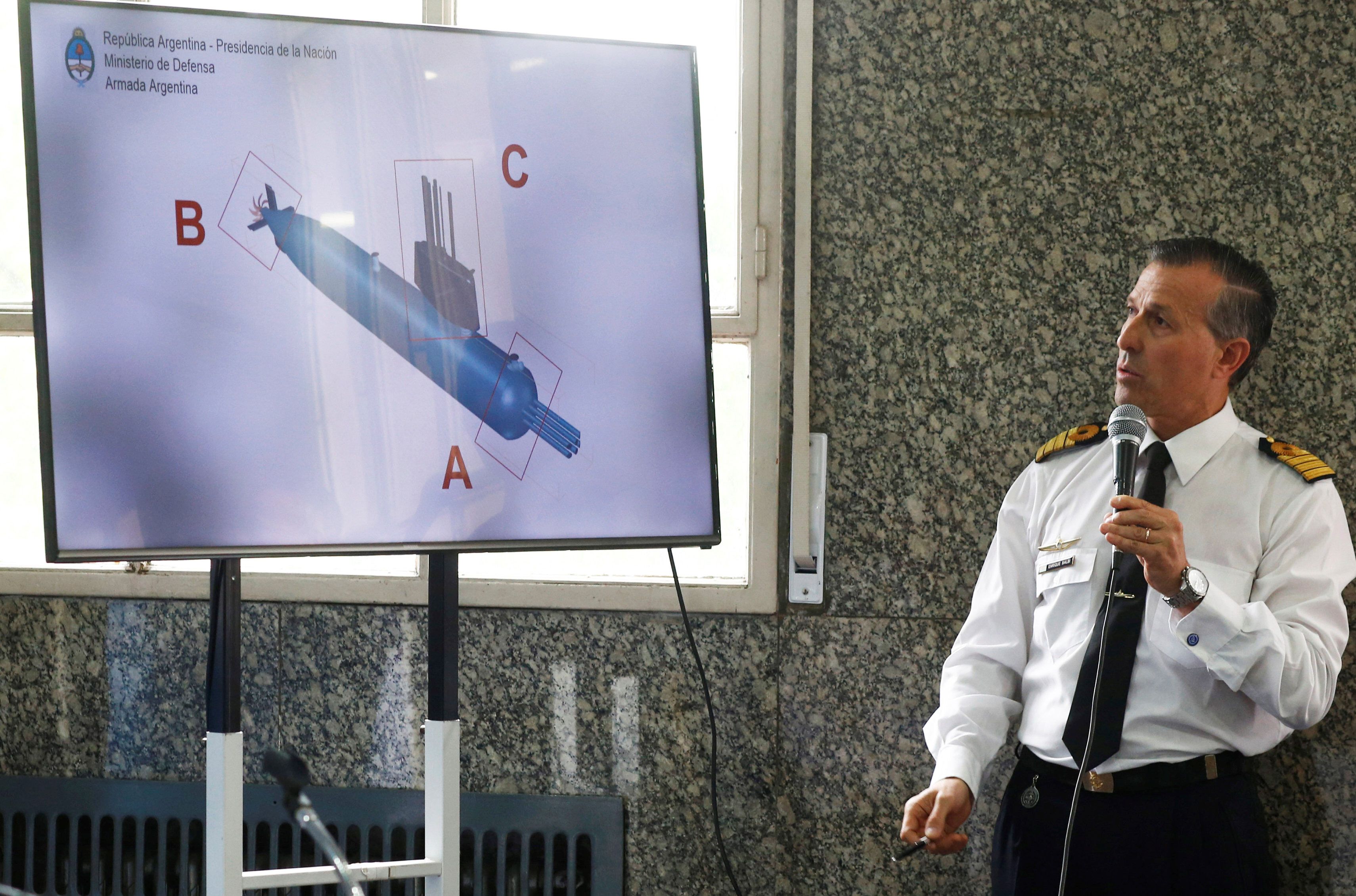El punto inspeccionado, añadió, fue detectado "a 907 metros de profundidad" sobre el lecho marino, y según las imágenes captadas por el dispositivo "el casco resistente se encuentra en una sola pieza, totalmente deformado, colapsado e implosionado, y sin aberturas de consideración". "Se detectó un tubo de aire de alta presión sobre el fondo, más adelante se hallaron pedazos de la libre circulación de popa. En cercanías se divisó el casco resistente en su totalidad desde popa hasta proa por la banda de estribor, observándose que no se encontraba ninguna parte externa al casco resistente adosada al mismo", señaló Attis ante los familiares.