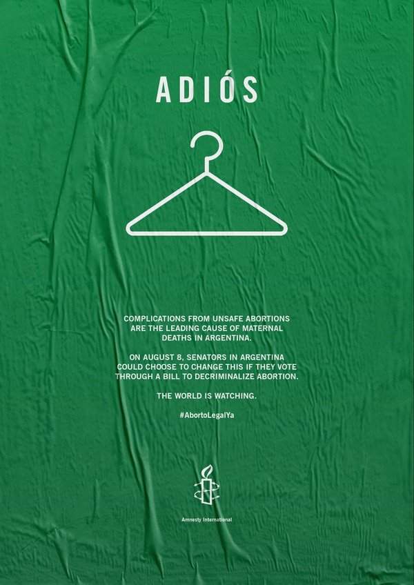 En la hoja puede leerse la palabra "Adiós" sobre la imagen de una percha, un símbolo asociado con abortos inseguros y clandestinos. "Las complicaciones por abortos inseguros son la principal causa de muerte materna en la Argentina", reza el texto.