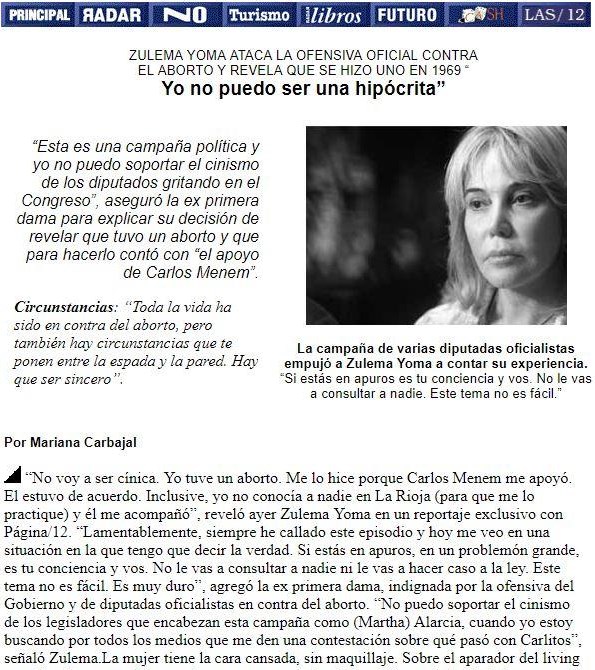 Las declaraciones de Zulema Yoma se dieron meses antes de las elecciones de 1999, que ganó la Alianza. En ese entonces solo algunos dirigentes como Graciela Fernández Meijide, que era candidata a gobernadora de Buenos Aires, y el fundador del sindicato docente CTERA Alfredo Bravo se manifestaron a favor de la despenalización del aborto.