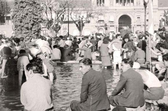 Ante el avance de los trabajadores que venían desde la zona Sur del Conurbano, la Policía resuelve levantar los puentes sobre el Riachuelo, pero la gente cruza en balsas y a nado. La multitud era imparable y en las primeras horas de la tarde colmó por completo la Plaza de Mayo, donde los manifestantes se refrescaron los pies en un fuente con tal de mitigar el efecto del calor.