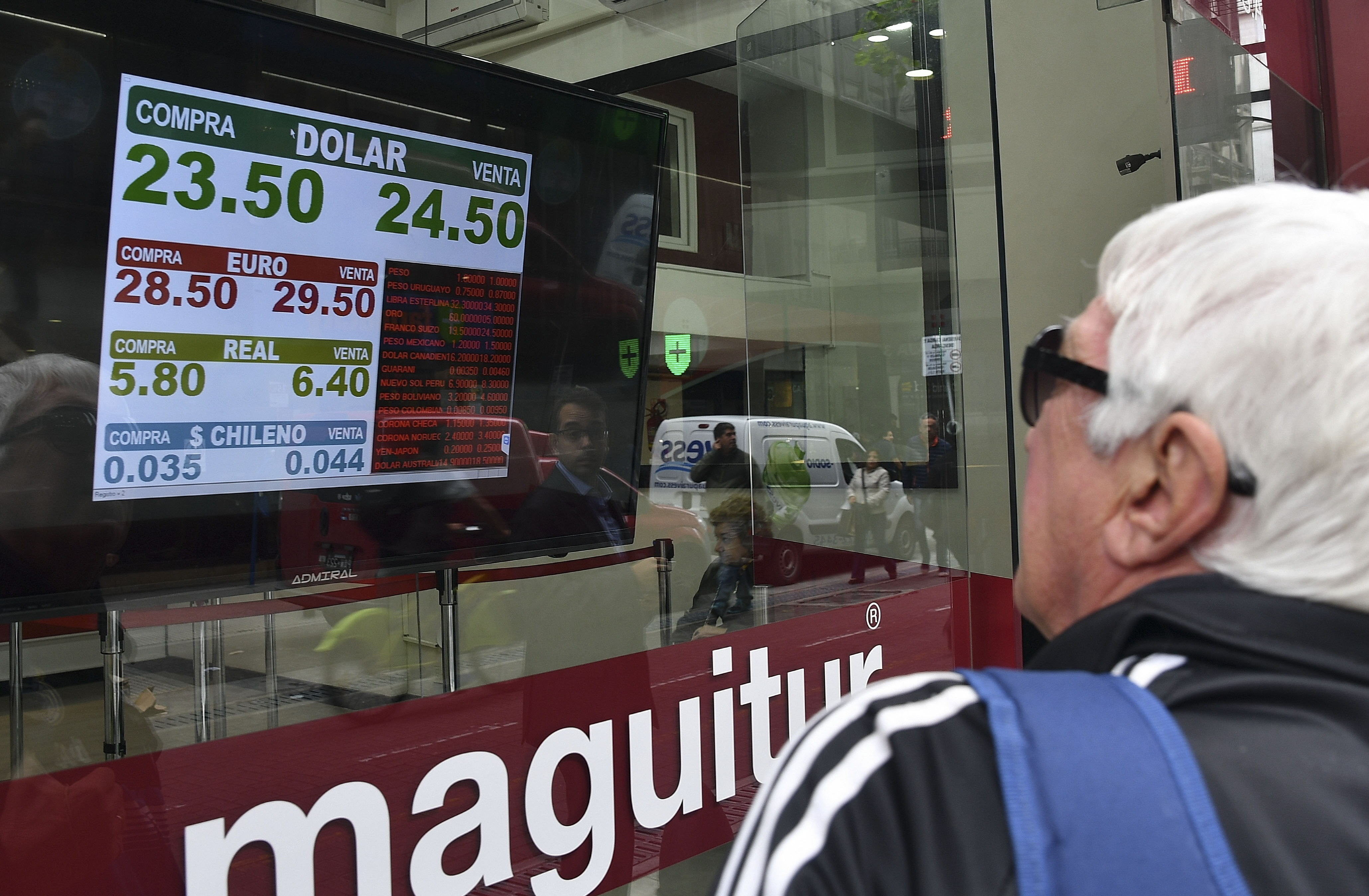 En alza. En la Ciudad de Buenos Aires, varias personas contemplaban los carteles con la cotización del dólar, que registra fuertes subas.