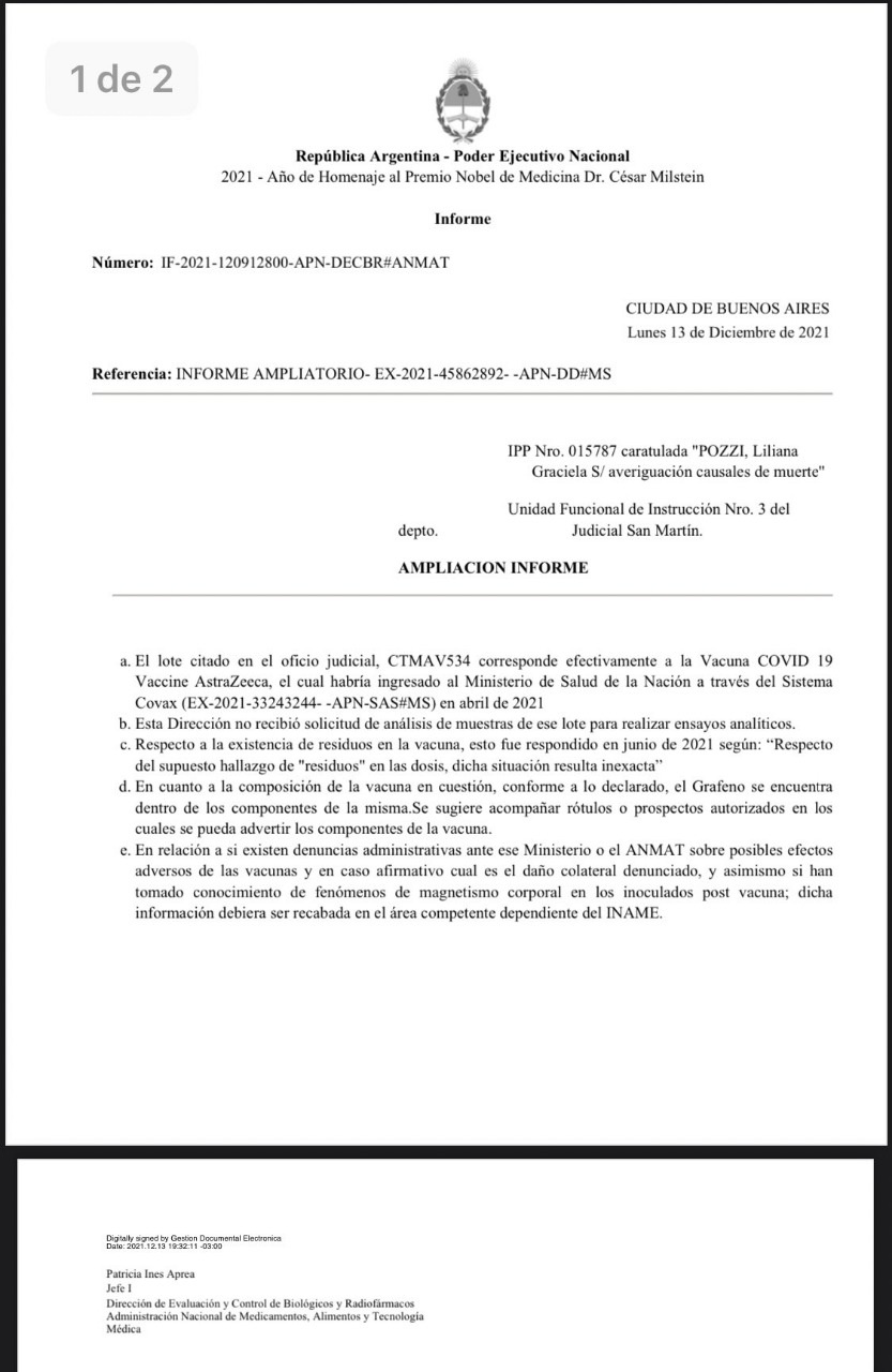 “La información sobre el contenido de grafeno surge de un error en el tipeo del Informe IF-2021-120912800-APN-DECBR#ANMAT adjunto al expediente judicial y que fuera aclarado en la declaración realizada día martes 11 de enero del corriente año, en la causa judicial correspondiente, por la responsable del área”, continuó.