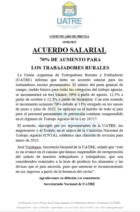 La Unión de Trabajadores Rurales y Estibadores (UATRE) obtuvo un aumento del 55% a pagar en tres cuotas. Sumado a los 15% de emergencia que obtuvo el mes pasado, la suma alcanzó el 70%. Es decir, el acuerdo, consensuado en el marco de la Comisión Nacional de Trabajo Agrario, implica una suba adicional de 55 puntos a los 15 que ya se habían pagado en julio.