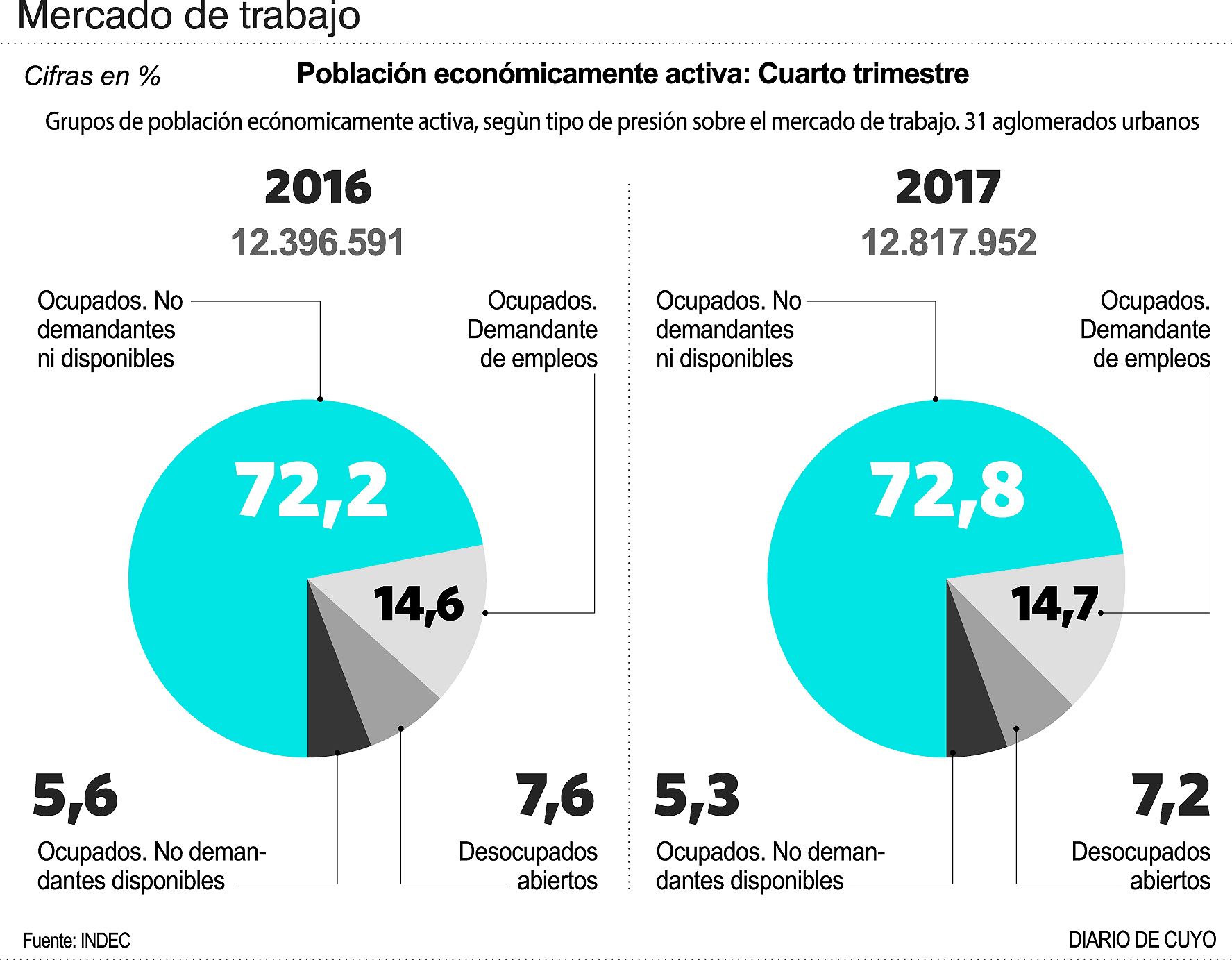 Los datos correspondientes al cuarto trimestre de 2017 mostraron una tasa de desocupación de 7,2% en el período, con un descenso de nueve décimas en relación al tercer trimestre del año pasado, cuando fue de 8,3%; y cuatro décimas menor al 7,6 de igual período de 2016.
