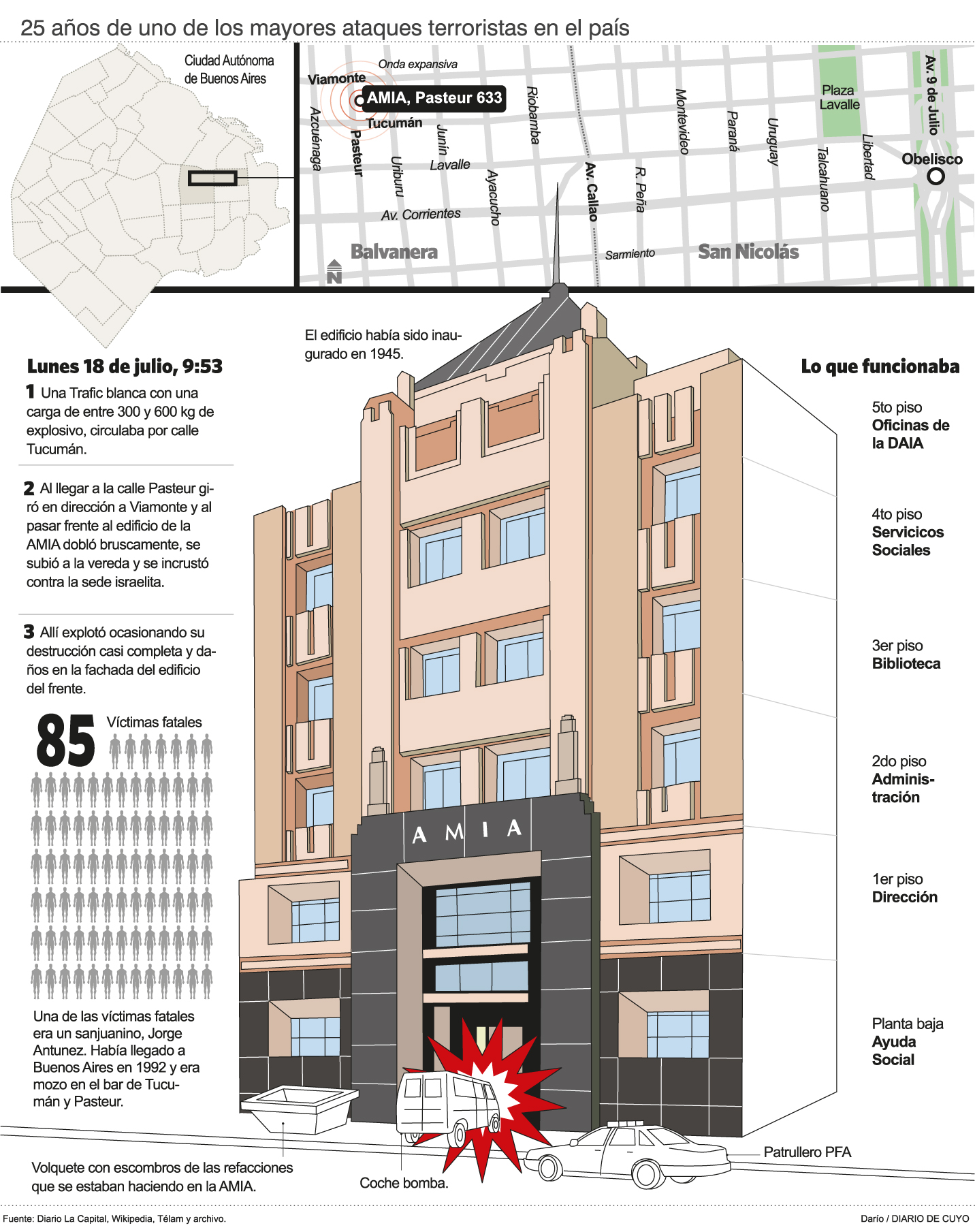 La sede de la Asociación Mutual Israelita Argentina (AMIA) de la calle Pasteur 633, en pleno corazón del barrio de Once, era demolida hace 25 años por un atentado terrorista que ocasionaba 85 muertos y más de 300 heridos, el mayor ataque contra un objetivo judío desde el Holocausto durante la II Guerra Mundial y que aún permanece impune. A las 9:53 del lunes 18 de julio de 1994, una explosión sacudió el barrio porteño de Once con una onda expansiva que afectó a más de mil viviendas en seis cuadras a la redonda.
