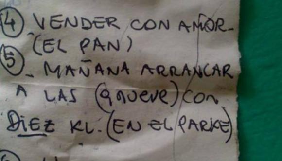 Córdoba, 23 de septiembre.- Una comunidad de vecinos de Córdoba busca a un joven desempleado que pasó vendiendo pan y al que se le cayó un particular papelito de tareas. "Vender con amor el pan", dice el punto número 4 de su lista. Los vecinos no saben su nombre y sólo lo conocen por un papelito que se le cayó cuando estaba trabajando en el barrio Escobar.