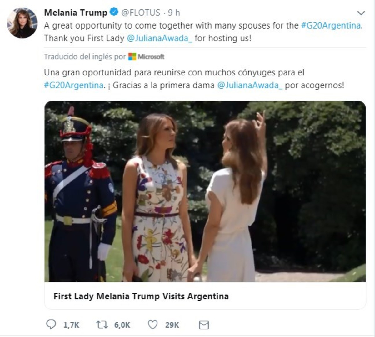 Desde Estados Unidos, Melania Trump le dedicó un mensaje de agradecimiento a Juliana Awada, esposa de Mauricio Macri, por haber sido anfitriona de las primeras damas durante la Cumbre del G20 que se realizó en Buenos Aires.