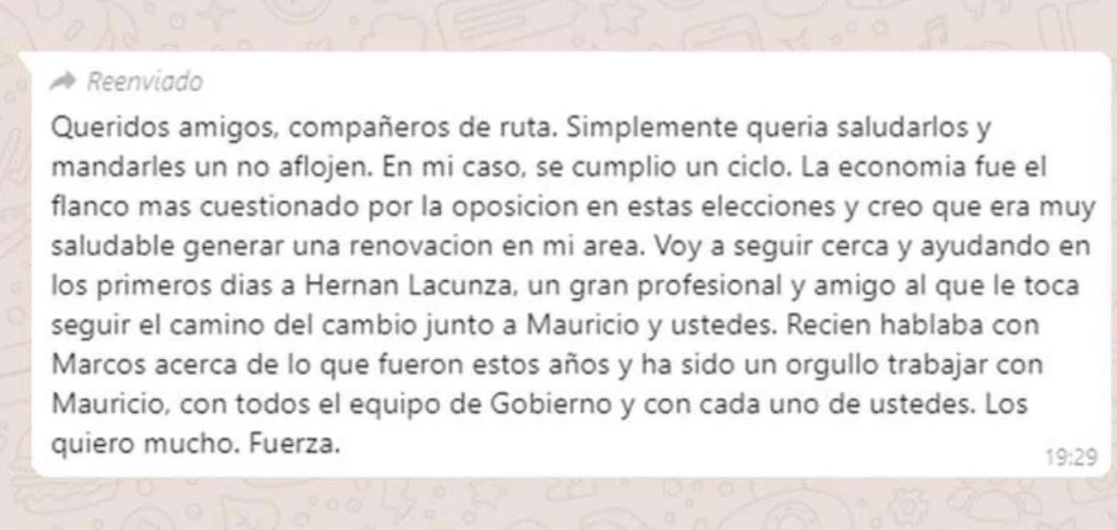 El mensaje se filtró el sábado por la tarde, minutos después de que se conociera la renuncia que el economista. En el mensaje que envió mediante WhatsApp, Dujovne les pidió a los ministros que "no aflojen" y explicó que, en su caso, "se cumplió un ciclo". "La economía fue el flanco más cuestionado por la oposición en estas elecciones y creo que era muy saludable generar una renovación en mi área", sostuvo.