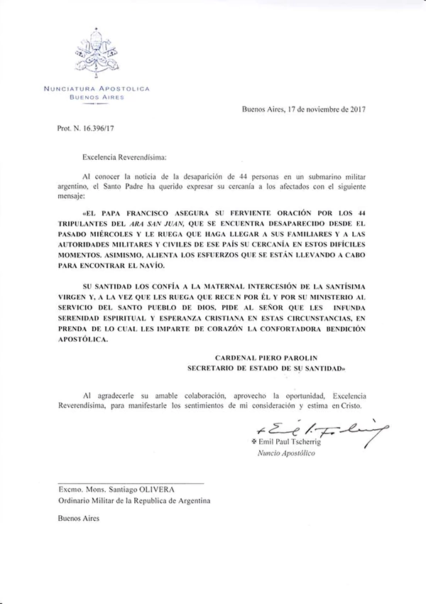 El Papa Francisco envió hoy un mensaje de aliento para los 44 tripulantes del Submarino ARA San Juan, desaparecido desde el miércoles en aguas de la provincia de Chubut. A través del obispo castrense, Monseñor Santiago Olivera, el Sumo Pontífice expresó “su ferviente oración” y “le ruega que haga llegar a sus familiares y a las autoridades militares y civiles de ese país su cercanía en estos difíciles momentos”.