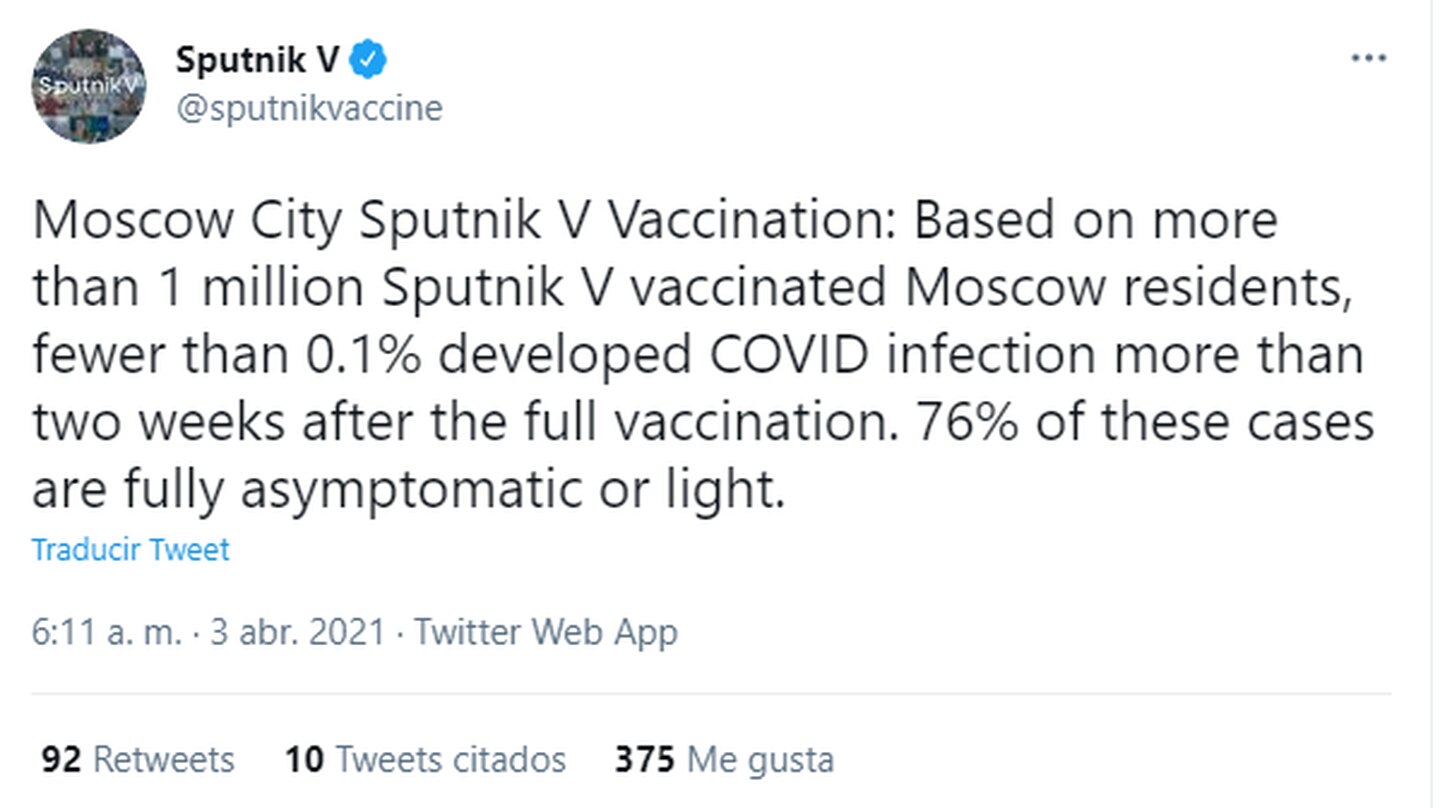 Pocas horas más tarde, la cuenta de la vacuna rusa realizó una publicación con datos estadísticos sobre los resultados de la campaña de inoculación en la capital del país.