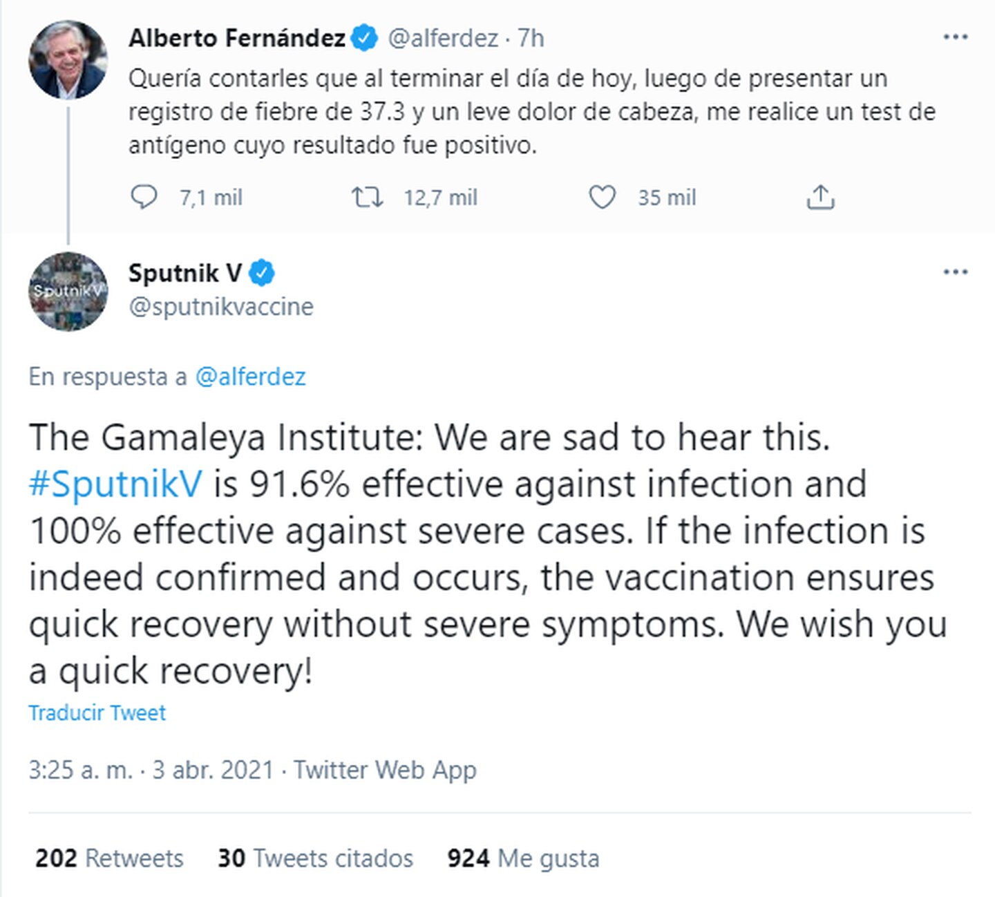 Luego de que Alberto Fernández confirmara a través de su Twitter que había dado positivo en coronavirus, el Instituto Gamaleya, de Rusia, le envió un mensaje desde la cuenta oficial de la vacuna Sputnik V. “La vacunación garantiza una recuperación rápida sin síntomas graves”, recordaron.