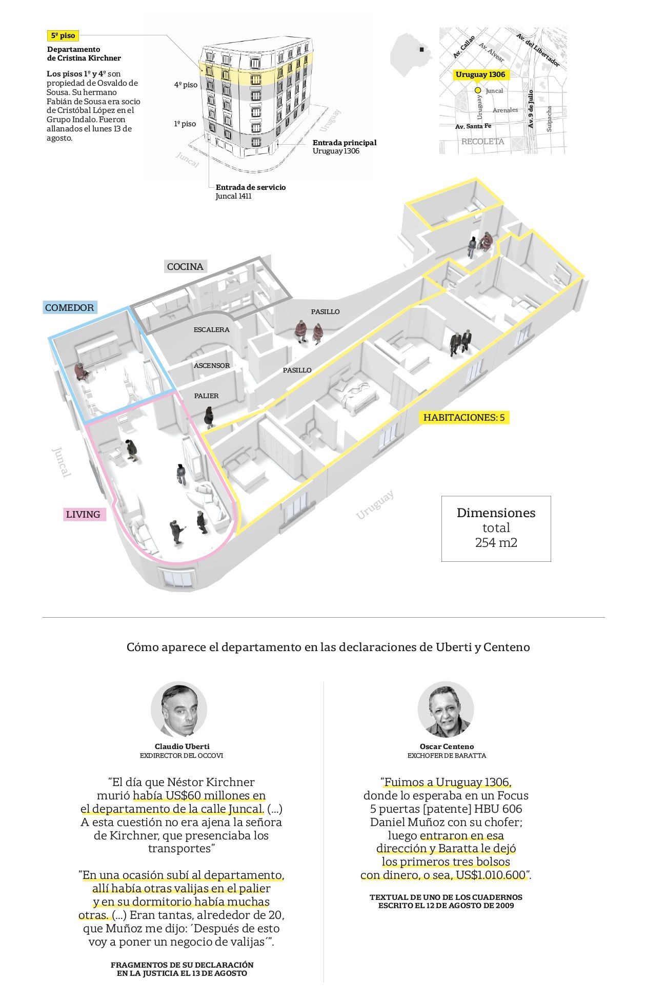El allanamiento de esta semana en dos departamentos del mismo edificio en el que vive la expresidenta -en el primero y el cuarto piso- se originó por datos de vecinos del barrio: uno que dijo haber visto movimientos sospechosos de camión de mudanzas que subía cajas en la puerta del edificio y otro contó que en uno de los departamentos todas las ventanas a la calle habían aparecido tapiadas con papel madera. Además, había sospechas por la forma en que se compraron los dos pisos en 2011. Quien se había presentado como el comprador en un primer momento (que pagó incluso la seña de uno de los inmuebles) no resultó ser quien se quedó finalmente con los departamentos a su nombre, que fue Osvaldo de Sousa, hermano del empresario Fabián de Sousa, del Grupo Indalo.