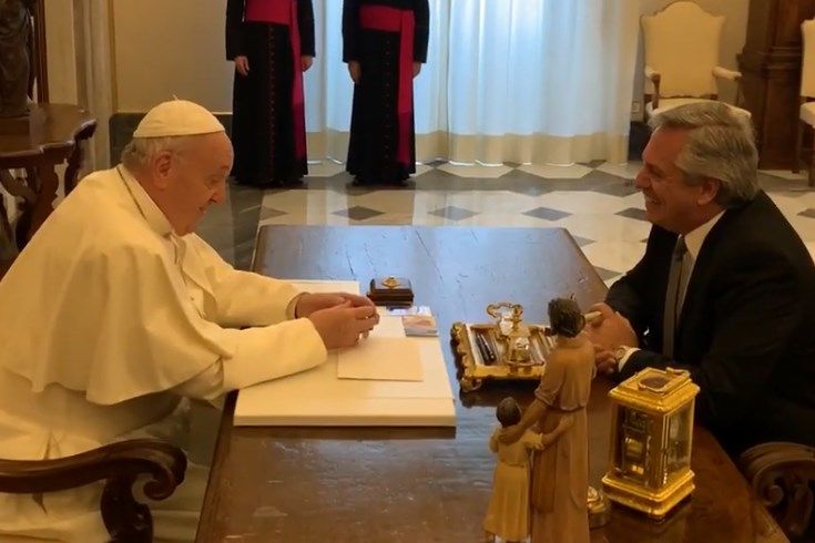 En la mañana de este viernes, el presidente Alberto Fernández se reunió con el papa Francisco en el Vaticano. El encuentro, que se llevó a cabo en la Biblioteca del Palacio Apostólico del Vaticano, finalizó a las 11:12 hora local (7.12 hora de la Argentina), luego de una conversación a solas que se extendió durante 44 minutos. Durante el intercambio de regalos, el Pontífice le pidió al Primer Mandatario: "Sean mensajeros de la paz".