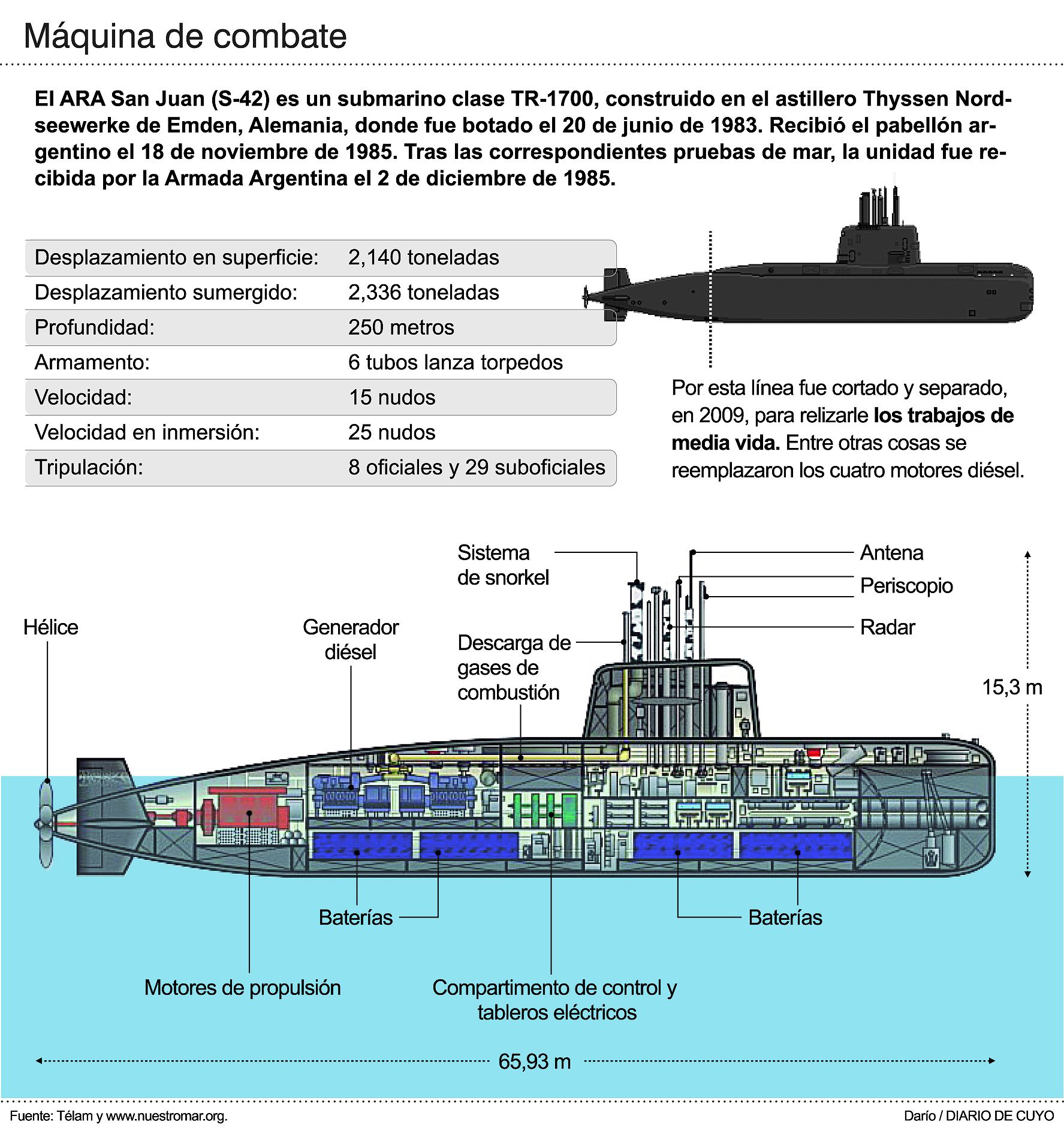 El ARA San Juan es de propulsión diésel-eléctrica convencional y sistema snorkel, concebido para ataques contra fuerzas de superficie, submarinos, tráfico mercante y operaciones de minado. Hace dos años finalizó su reparación de media vida en astilleros de Buenos Aires, aunque se cree que le falta mantenimiento.
