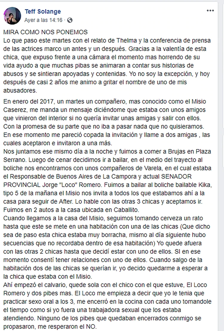La decisión del senador, apodado "El loco", se dio tras la denuncia en redes sociales de "Teff Solange", una ex integrante de La Cámpora, quien contó que Romero la encerró en un baño durante una fiesta, le mostró su pene y quiso obligarla a que le practique sexo oral.