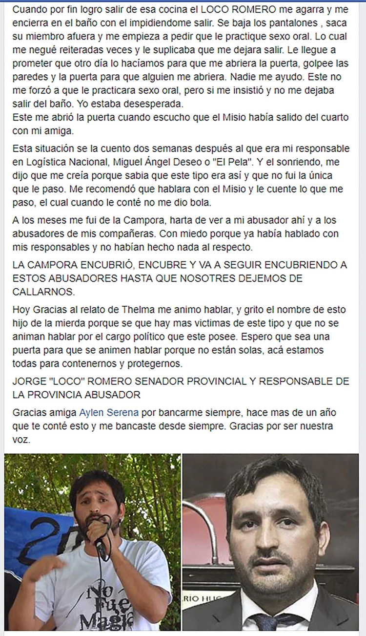 "La Cámpora encubrió, encubre y va a seguir encubriendo a estos abusadores hasta que nosotres dejemos de callarnos", escribió la víctima.
