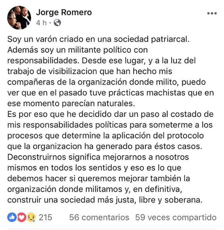 "Soy un varón criado en una sociedad patriarcal. Además soy un militante político con responsabilidades. Desde ese lugar, y a la luz del trabajo de visibilizacion que han hecho mis compañeras de la organización donde milito, puedo ver que en el pasado tuve prácticas machistas que en ese momento parecían naturales. Es por eso que he decidido dar un paso al costado de mis responsabilidades políticas para someterme a los procesos que determine la aplicación del protocolo que la organización ha generado para estos casos", escribió Romero.